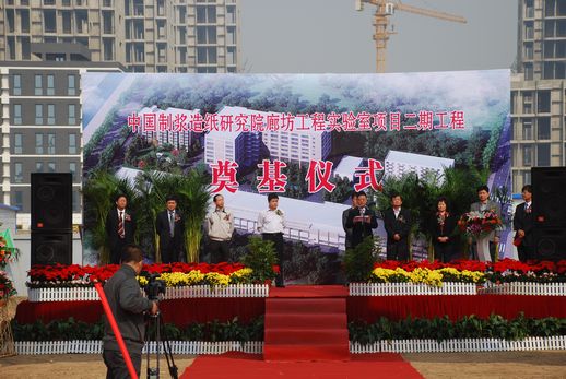 2012年10月12日,俞海星总经理出席了中国制浆造纸研究院廊坊工程实验室项目二期工程开工奠基仪式。俞总在致辞中对造纸院廊坊项目建设工作给予了充分肯定,对长期以来关心和支持中轻集团发展,特别是关心和支持该项目筹备实施的廊坊市各级领导和部门表示了感谢,并向为工程开工付出辛勤劳动的一线干部职工表示了慰问。他希望项目承建单位要切实增强紧迫感和责任感,严格工程管理,确保安全、质量和进度,力争把项目建设成为廊坊科技谷的标志性、样板性工程。中国制浆造纸研究院院长曹春昱和廊坊科技谷有关领导也分别在仪式上致辞。